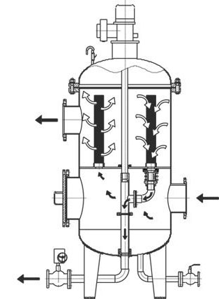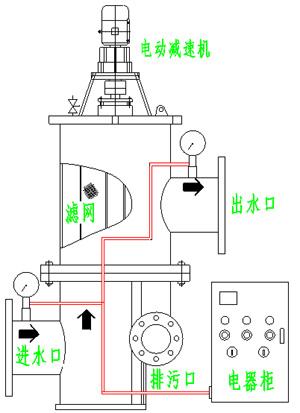 電動濾水器過濾工作原理圖如下右圖所示,水源從進水口進入電動濾水器,當水中雜質通過網芯時,雜質由于體積大于網芯孔而被截留在網芯上。過濾后的凈水從出水口流出。當雜質聚積到一定數量時,進水口與出水口之間形成壓差,此時進行排污,將雜志從排污口排出。
